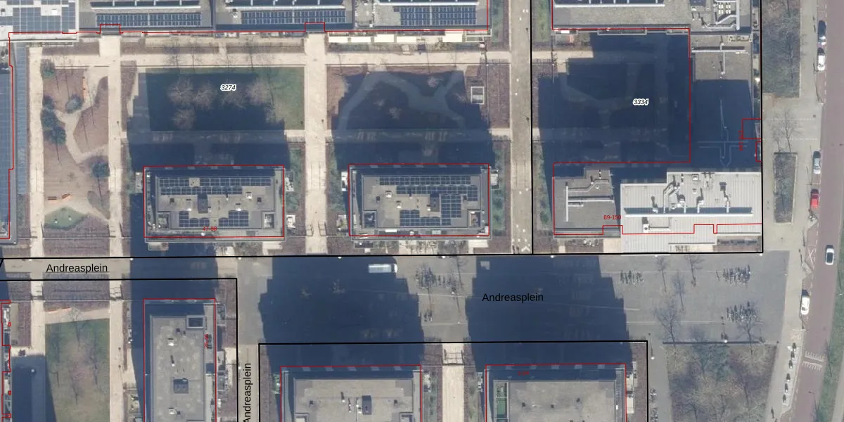 Het perceel waarop Andreasplein 79 staat heeft een oppervlakte van 9895 m². Dit is een zeer groot perceel. De perceeloppervlakte wordt geregistreerd door het Kadaster. Gedetailleerde informatie over de maten van dit perceel kunt u vinden in het rapport Kadastrale kaart met maatvoering van Andreasplein 79.