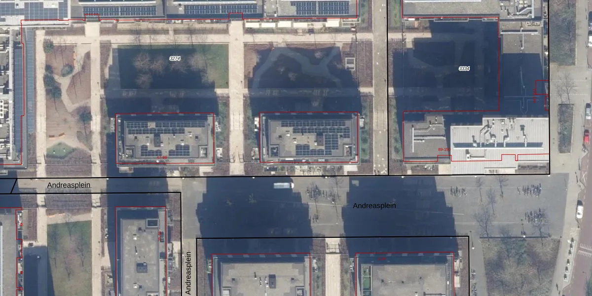 Het perceel waarop Andreasplein 86 staat heeft een oppervlakte van 9895 m². Dit is een zeer groot perceel. De perceeloppervlakte wordt geregistreerd door het Kadaster. Gedetailleerde informatie over de maten van dit perceel kunt u vinden in het rapport Kadastrale kaart met maatvoering van Andreasplein 86.