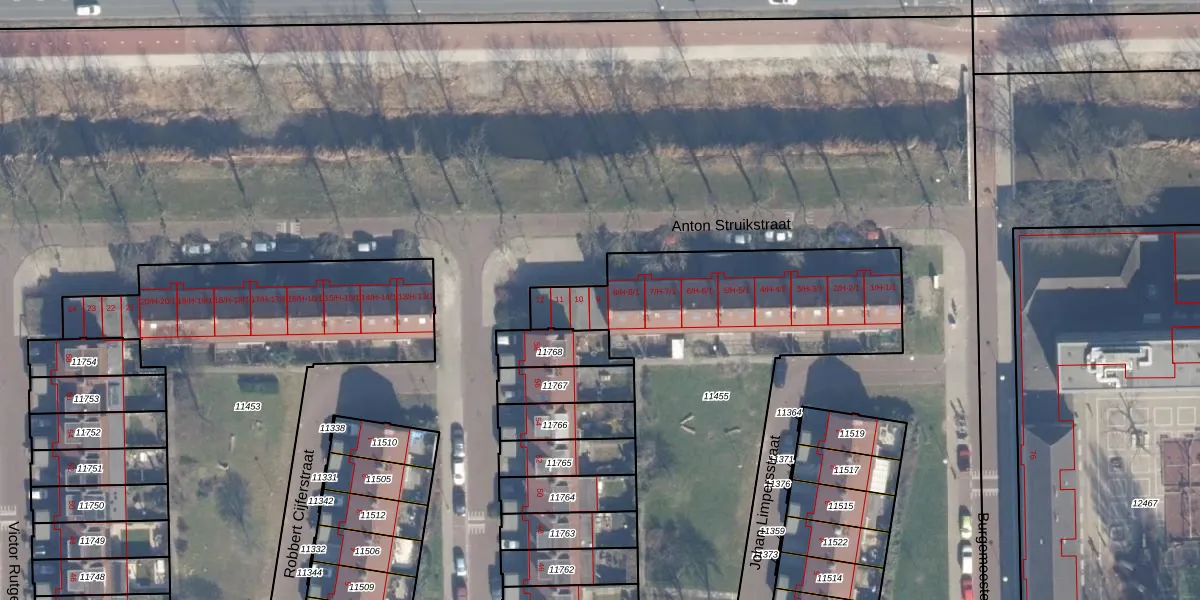 Het perceel waarop Anton Struikstraat 9 staat heeft een oppervlakte van 1894 m². Dit is een zeer groot perceel. De perceeloppervlakte wordt geregistreerd door het Kadaster. Gedetailleerde informatie over de maten van dit perceel kunt u vinden in het rapport Kadastrale kaart met maatvoering van Anton Struikstraat 9.