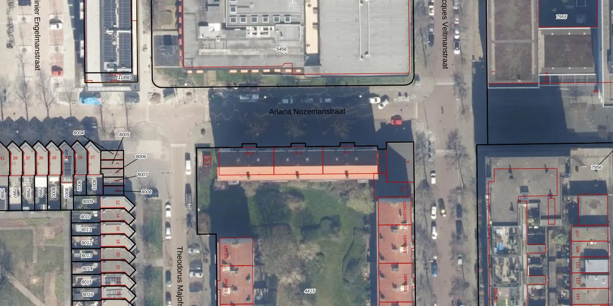 Het perceel waarop Ariana Nozemanstraat 13-1 staat heeft een oppervlakte van 6153 m². Dit is een zeer groot perceel. De perceeloppervlakte wordt geregistreerd door het Kadaster. Gedetailleerde informatie over de maten van dit perceel kunt u vinden in het rapport Kadastrale kaart met maatvoering van Ariana Nozemanstraat 13-1.