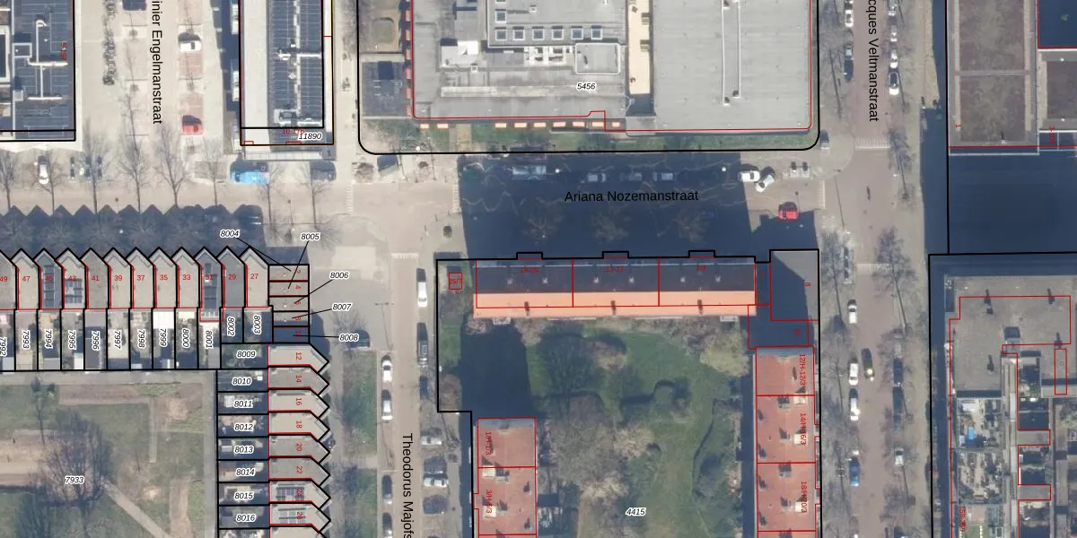 Het perceel waarop Ariana Nozemanstraat 21-2 staat heeft een oppervlakte van 6153 m². Dit is een zeer groot perceel. De perceeloppervlakte wordt geregistreerd door het Kadaster. Gedetailleerde informatie over de maten van dit perceel kunt u vinden in het rapport Kadastrale kaart met maatvoering van Ariana Nozemanstraat 21-2.