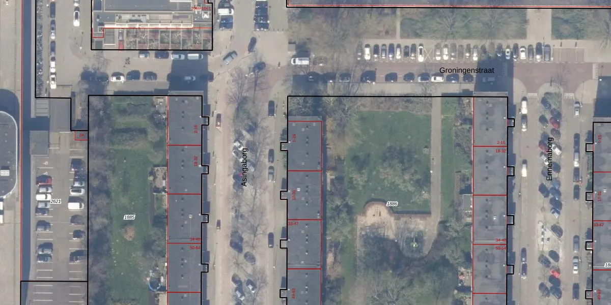 Het perceel waarop Asingaborg 13 staat heeft een oppervlakte van 6642 m². Dit is een zeer groot perceel. De perceeloppervlakte wordt geregistreerd door het Kadaster. Gedetailleerde informatie over de maten van dit perceel kunt u vinden in het rapport Kadastrale kaart met maatvoering van Asingaborg 13.