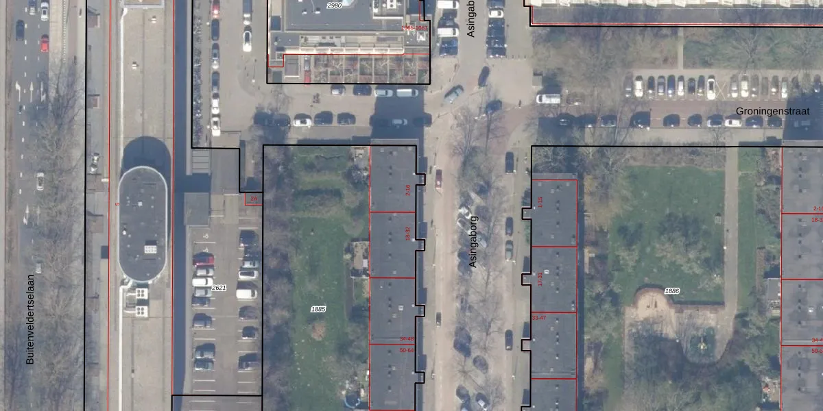 Het perceel waarop Asingaborg 16 staat heeft een oppervlakte van 3303 m². Dit is een zeer groot perceel. De perceeloppervlakte wordt geregistreerd door het Kadaster. Gedetailleerde informatie over de maten van dit perceel kunt u vinden in het rapport Kadastrale kaart met maatvoering van Asingaborg 16.