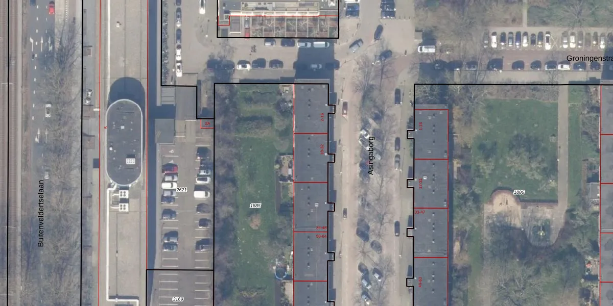 Het perceel waarop Asingaborg 24 staat heeft een oppervlakte van 3303 m². Dit is een zeer groot perceel. De perceeloppervlakte wordt geregistreerd door het Kadaster. Gedetailleerde informatie over de maten van dit perceel kunt u vinden in het rapport Kadastrale kaart met maatvoering van Asingaborg 24.