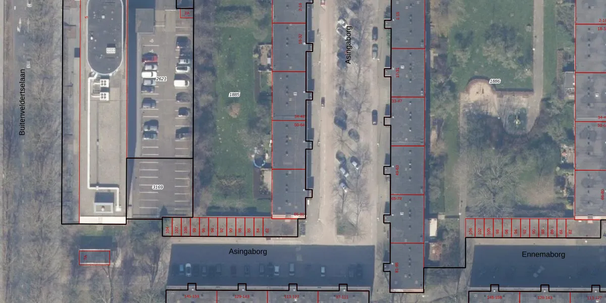 Het perceel waarop Asingaborg 58 staat heeft een oppervlakte van 3303 m². Dit is een zeer groot perceel. De perceeloppervlakte wordt geregistreerd door het Kadaster. Gedetailleerde informatie over de maten van dit perceel kunt u vinden in het rapport Kadastrale kaart met maatvoering van Asingaborg 58.