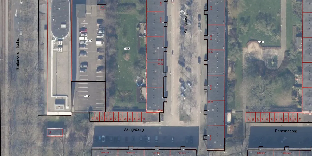 Het perceel waarop Asingaborg 62 staat heeft een oppervlakte van 3303 m². Dit is een zeer groot perceel. De perceeloppervlakte wordt geregistreerd door het Kadaster. Gedetailleerde informatie over de maten van dit perceel kunt u vinden in het rapport Kadastrale kaart met maatvoering van Asingaborg 62.