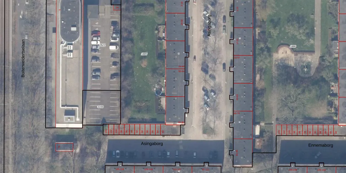 Het perceel waarop Asingaborg 64 staat heeft een oppervlakte van 3303 m². Dit is een zeer groot perceel. De perceeloppervlakte wordt geregistreerd door het Kadaster. Gedetailleerde informatie over de maten van dit perceel kunt u vinden in het rapport Kadastrale kaart met maatvoering van Asingaborg 64.