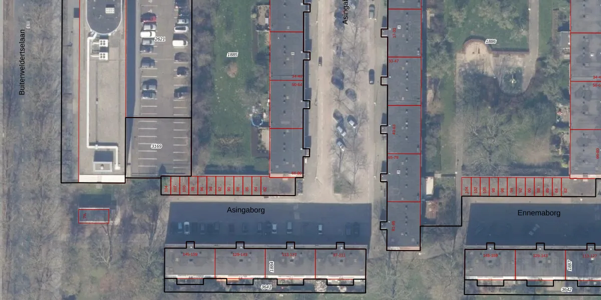 Het perceel waarop Asingaborg 66 staat heeft een oppervlakte van 3303 m². Dit is een zeer groot perceel. De perceeloppervlakte wordt geregistreerd door het Kadaster. Gedetailleerde informatie over de maten van dit perceel kunt u vinden in het rapport Kadastrale kaart met maatvoering van Asingaborg 66.