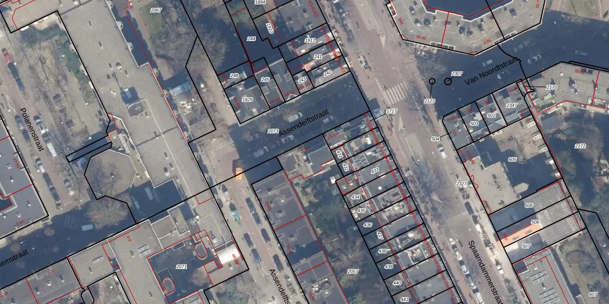 Assendelftstraat 15 is gelegen op kadastraal perceel ASD20X2057. Deze kadastrale aanduiding is uniek en wordt gebruikt door het Kadaster om eigendomsrechten en andere zakelijke rechten vast te leggen. Het perceel maakt onderdeel uit van de kadastrale gemeente Amsterdam.