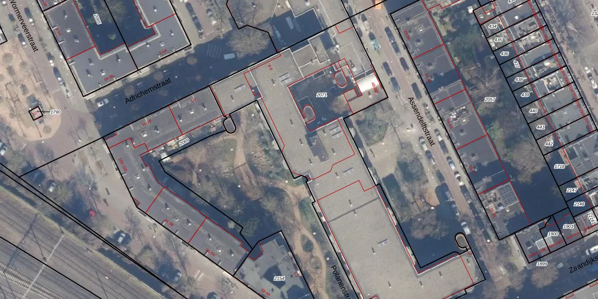 Assendelftstraat 164 is gelegen op kadastraal perceel ASD20X2071. Deze kadastrale aanduiding is uniek en wordt gebruikt door het Kadaster om eigendomsrechten en andere zakelijke rechten vast te leggen. Het perceel maakt onderdeel uit van de kadastrale gemeente Amsterdam.