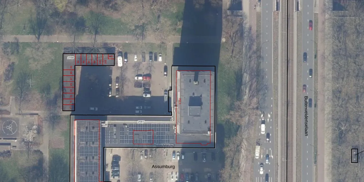 Het perceel waarop Assumburg 104 staat heeft een oppervlakte van 2815 m². Dit is een zeer groot perceel. De perceeloppervlakte wordt geregistreerd door het Kadaster. Gedetailleerde informatie over de maten van dit perceel kunt u vinden in het rapport Kadastrale kaart met maatvoering van Assumburg 104.