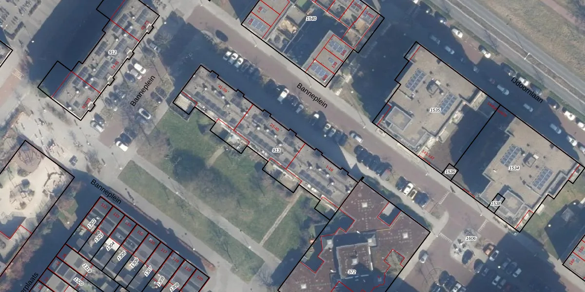 Het perceel waarop Banneplein 29 staat heeft een oppervlakte van 1002 m². Dit is een zeer groot perceel. De perceeloppervlakte wordt geregistreerd door het Kadaster. Gedetailleerde informatie over de maten van dit perceel kunt u vinden in het rapport Kadastrale kaart met maatvoering van Banneplein 29.