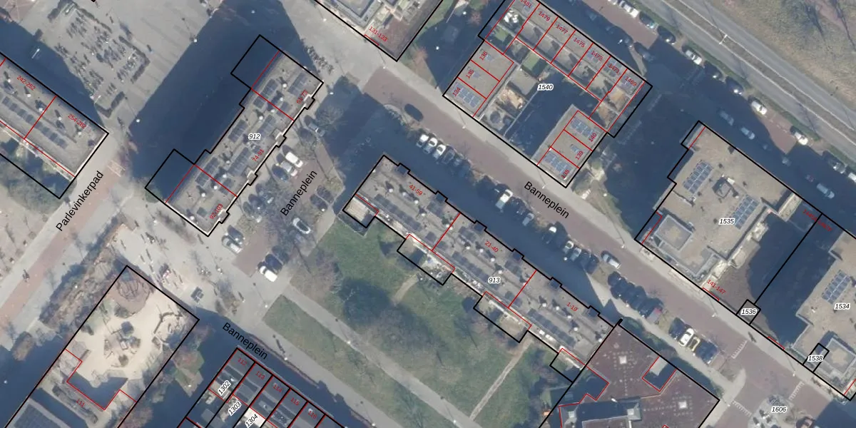 Het perceel waarop Banneplein 43 staat heeft een oppervlakte van 1002 m². Dit is een zeer groot perceel. De perceeloppervlakte wordt geregistreerd door het Kadaster. Gedetailleerde informatie over de maten van dit perceel kunt u vinden in het rapport Kadastrale kaart met maatvoering van Banneplein 43.