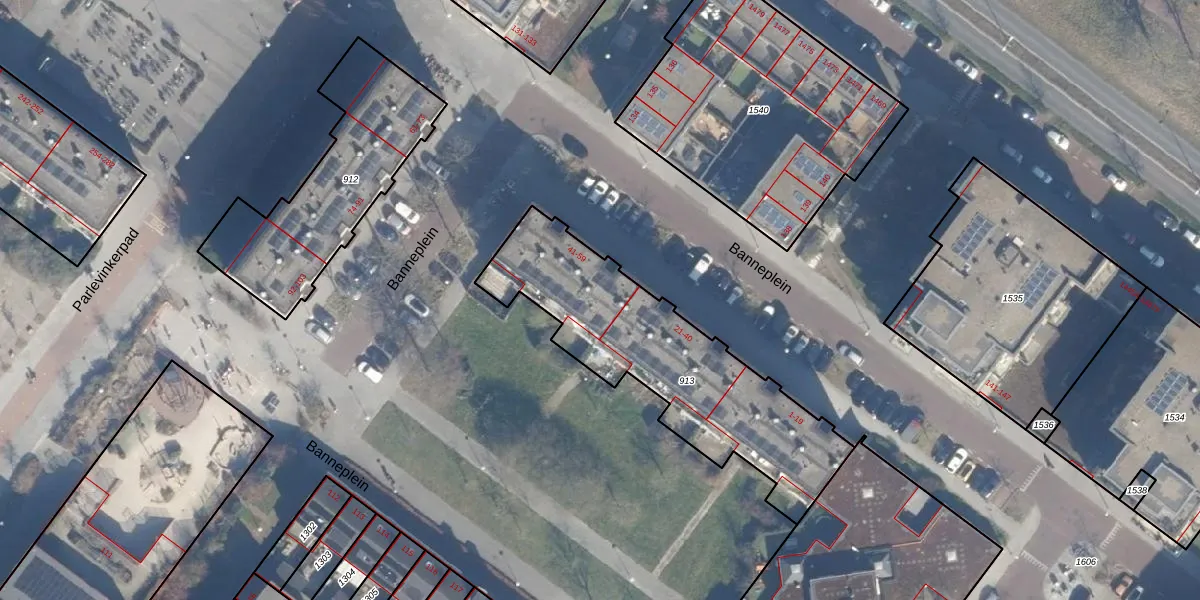 Banneplein 45 is gelegen op kadastraal perceel ASD32AM913. Deze kadastrale aanduiding is uniek en wordt gebruikt door het Kadaster om eigendomsrechten en andere zakelijke rechten vast te leggen. Het perceel maakt onderdeel uit van de kadastrale gemeente Amsterdam.