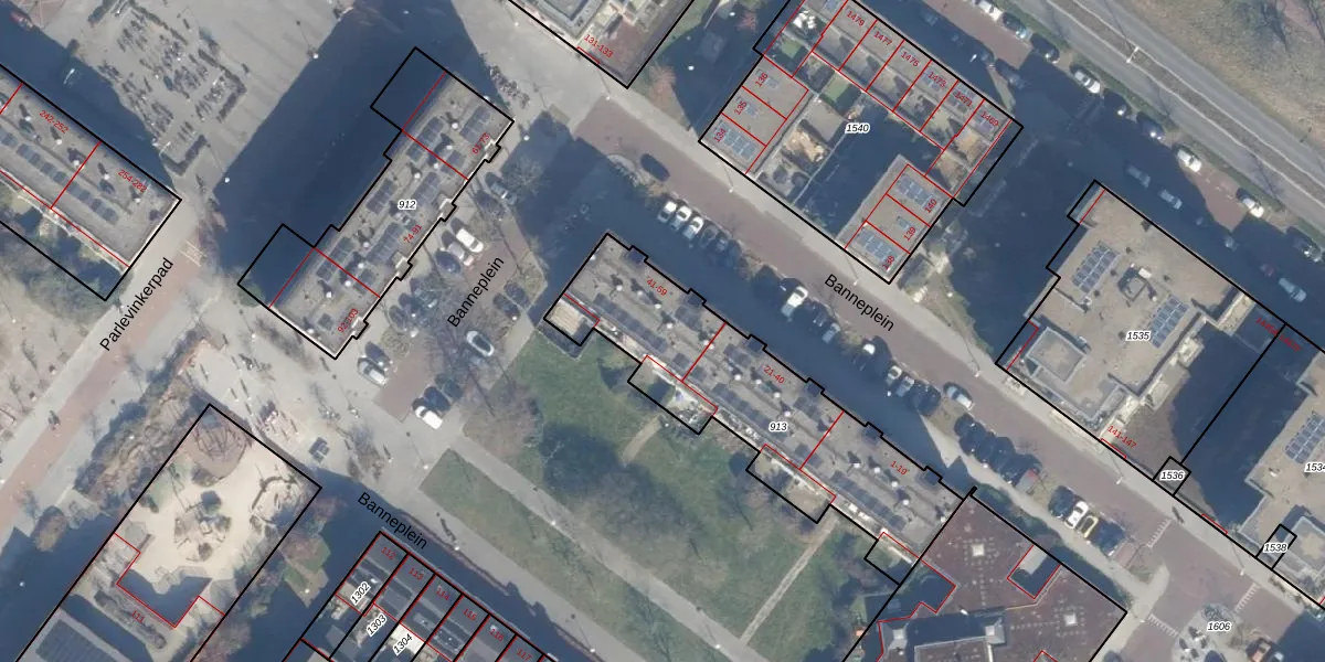 Het perceel waarop Banneplein 49 staat heeft een oppervlakte van 1002 m². Dit is een zeer groot perceel. De perceeloppervlakte wordt geregistreerd door het Kadaster. Gedetailleerde informatie over de maten van dit perceel kunt u vinden in het rapport Kadastrale kaart met maatvoering van Banneplein 49.