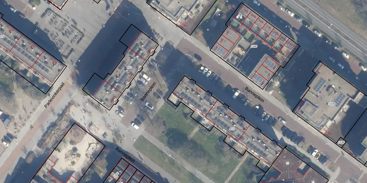 Het perceel waarop Banneplein 56 staat heeft een oppervlakte van 1002 m². Dit is een zeer groot perceel. De perceeloppervlakte wordt geregistreerd door het Kadaster. Gedetailleerde informatie over de maten van dit perceel kunt u vinden in het rapport Kadastrale kaart met maatvoering van Banneplein 56.