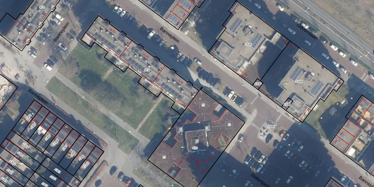 Het perceel waarop Banneplein 9 staat heeft een oppervlakte van 1002 m². Dit is een zeer groot perceel. De perceeloppervlakte wordt geregistreerd door het Kadaster. Gedetailleerde informatie over de maten van dit perceel kunt u vinden in het rapport Kadastrale kaart met maatvoering van Banneplein 9.
