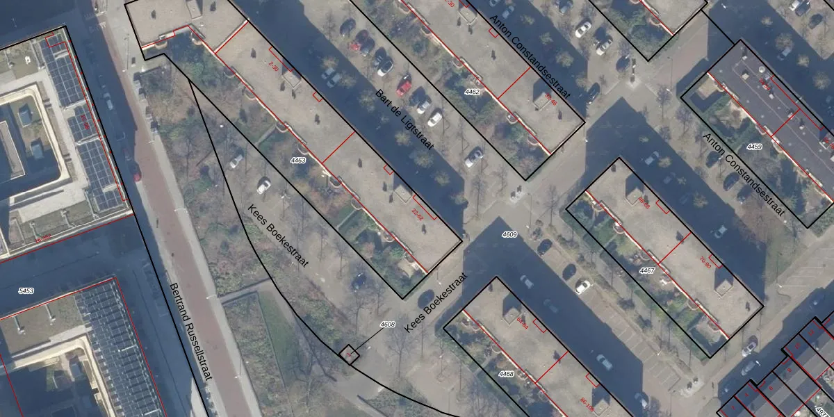Het perceel waarop Bart de Ligtstraat 54 staat heeft een oppervlakte van 1888 m². Dit is een zeer groot perceel. De perceeloppervlakte wordt geregistreerd door het Kadaster. Gedetailleerde informatie over de maten van dit perceel kunt u vinden in het rapport Kadastrale kaart met maatvoering van Bart de Ligtstraat 54.