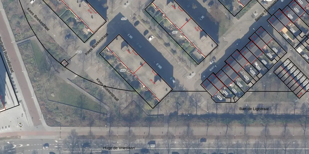 Het perceel waarop Bart de Ligtstraat 88 staat heeft een oppervlakte van 891 m². Dit is een groot perceel. De perceeloppervlakte wordt geregistreerd door het Kadaster. Gedetailleerde informatie over de maten van dit perceel kunt u vinden in het rapport Kadastrale kaart met maatvoering van Bart de Ligtstraat 88.