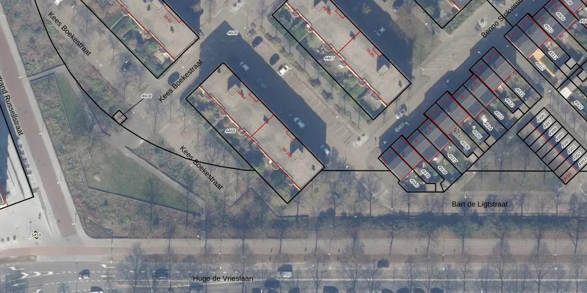 Het perceel waarop Bart de Ligtstraat 90 staat heeft een oppervlakte van 891 m². Dit is een groot perceel. De perceeloppervlakte wordt geregistreerd door het Kadaster. Gedetailleerde informatie over de maten van dit perceel kunt u vinden in het rapport Kadastrale kaart met maatvoering van Bart de Ligtstraat 90.
