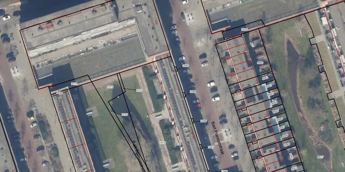 Het perceel waarop Bart Poesiatstraat 80 staat heeft een oppervlakte van 3143 m². Dit is een zeer groot perceel. De perceeloppervlakte wordt geregistreerd door het Kadaster. Gedetailleerde informatie over de maten van dit perceel kunt u vinden in het rapport Kadastrale kaart met maatvoering van Bart Poesiatstraat 80.