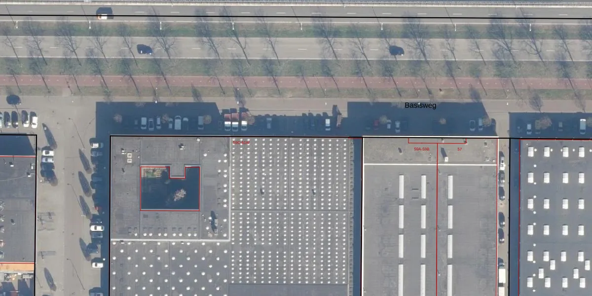 Het perceel waarop Basisweg 59-C staat heeft een oppervlakte van 1,1 ha. Dit is een zeer groot perceel. De perceeloppervlakte wordt geregistreerd door het Kadaster. Gedetailleerde informatie over de maten van dit perceel kunt u vinden in het rapport Kadastrale kaart met maatvoering van Basisweg 59-C.