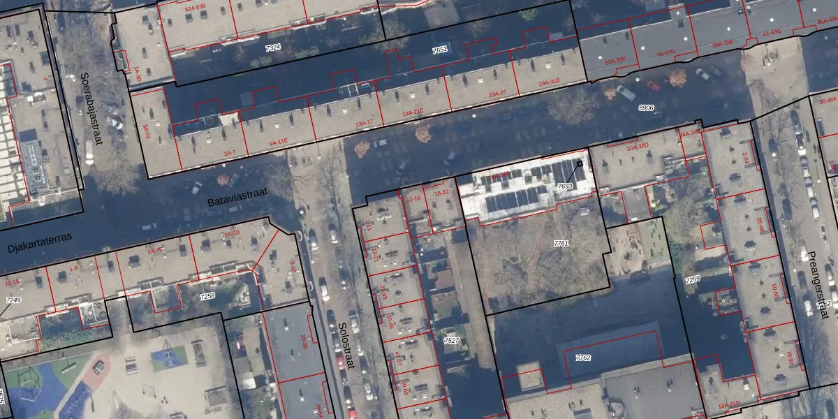 Het perceel waarop Bataviastraat 14 staat heeft een oppervlakte van 1757 m². Dit is een zeer groot perceel. De perceeloppervlakte wordt geregistreerd door het Kadaster. Gedetailleerde informatie over de maten van dit perceel kunt u vinden in het rapport Kadastrale kaart met maatvoering van Bataviastraat 14.