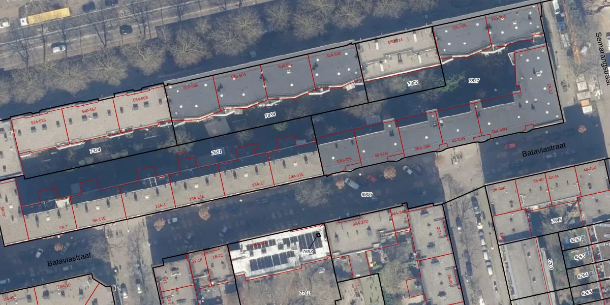 Het perceel waarop Bataviastraat 29-C staat heeft een oppervlakte van 2168 m². Dit is een zeer groot perceel. De perceeloppervlakte wordt geregistreerd door het Kadaster. Gedetailleerde informatie over de maten van dit perceel kunt u vinden in het rapport Kadastrale kaart met maatvoering van Bataviastraat 29-C.
