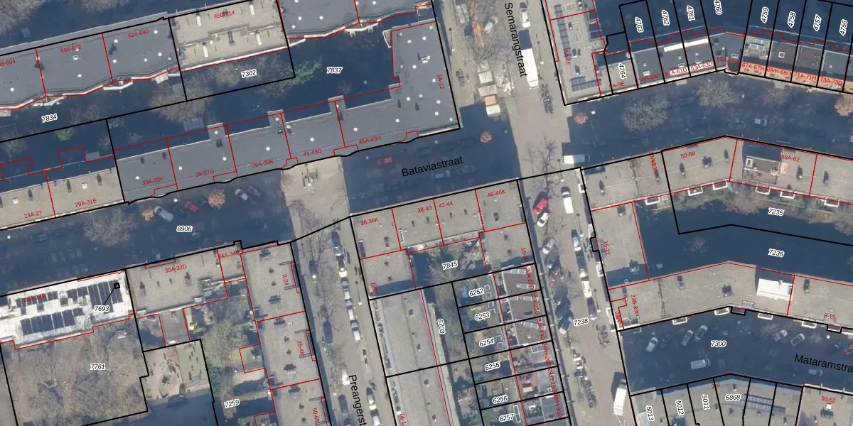 Bataviastraat 40 is gelegen op kadastraal perceel ASD19W7845. Deze kadastrale aanduiding is uniek en wordt gebruikt door het Kadaster om eigendomsrechten en andere zakelijke rechten vast te leggen. Het perceel maakt onderdeel uit van de kadastrale gemeente Amsterdam.