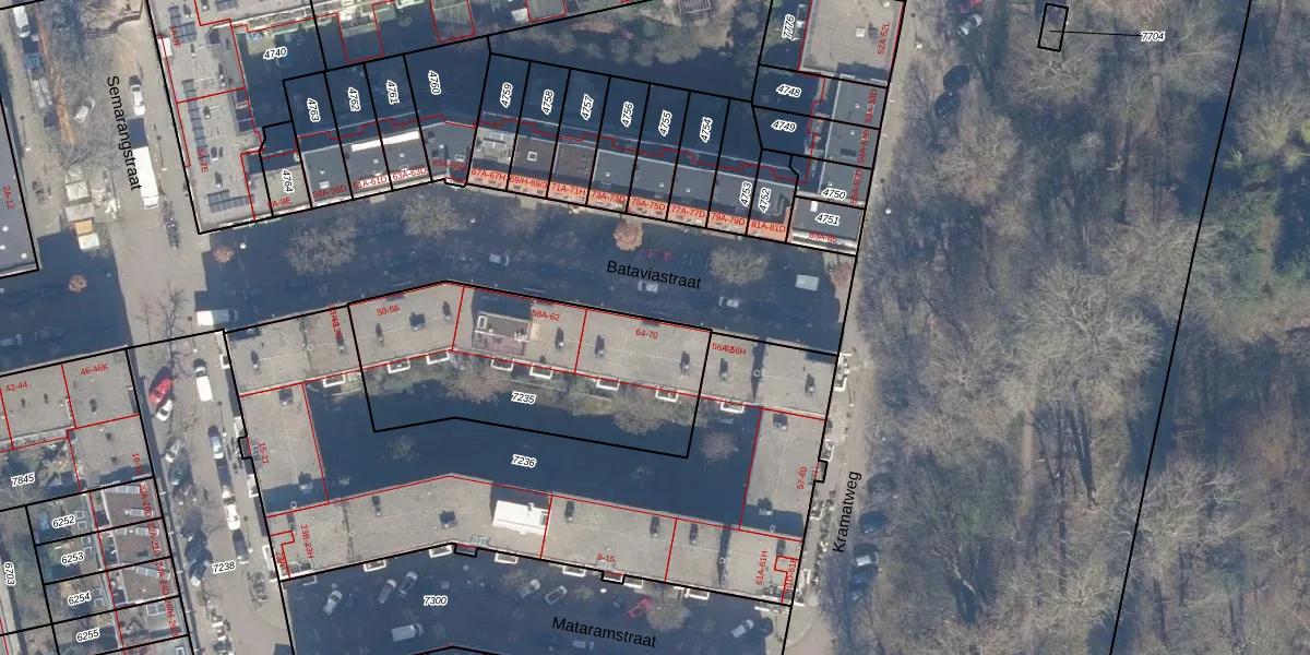 Het perceel waarop Bataviastraat 68-A staat heeft een oppervlakte van 1038 m². Dit is een zeer groot perceel. De perceeloppervlakte wordt geregistreerd door het Kadaster. Gedetailleerde informatie over de maten van dit perceel kunt u vinden in het rapport Kadastrale kaart met maatvoering van Bataviastraat 68-A.