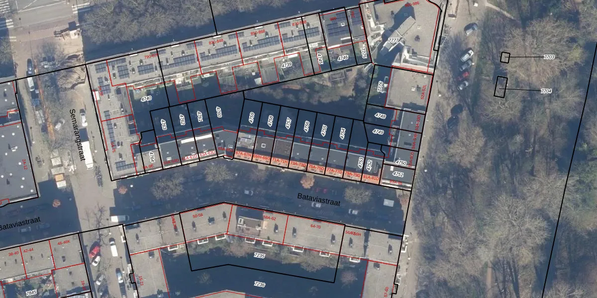 Bataviastraat 73-D is gelegen op kadastraal perceel ASD19W4756. Deze kadastrale aanduiding is uniek en wordt gebruikt door het Kadaster om eigendomsrechten en andere zakelijke rechten vast te leggen. Het perceel maakt onderdeel uit van de kadastrale gemeente Amsterdam.