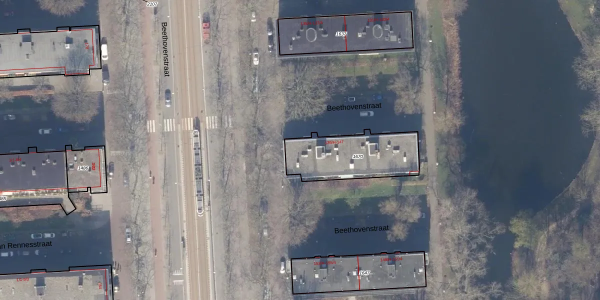 Het perceel waarop Beethovenstraat 139-2 staat heeft een oppervlakte van 638 m². Dit is een groot perceel. De perceeloppervlakte wordt geregistreerd door het Kadaster. Gedetailleerde informatie over de maten van dit perceel kunt u vinden in het rapport Kadastrale kaart met maatvoering van Beethovenstraat 139-2.