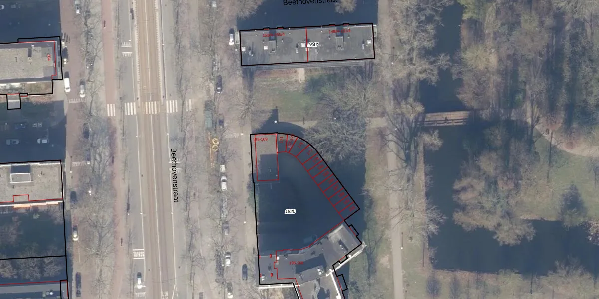 Het perceel waarop Beethovenstraat 175 staat heeft een oppervlakte van 1565 m². Dit is een zeer groot perceel. De perceeloppervlakte wordt geregistreerd door het Kadaster. Gedetailleerde informatie over de maten van dit perceel kunt u vinden in het rapport Kadastrale kaart met maatvoering van Beethovenstraat 175.