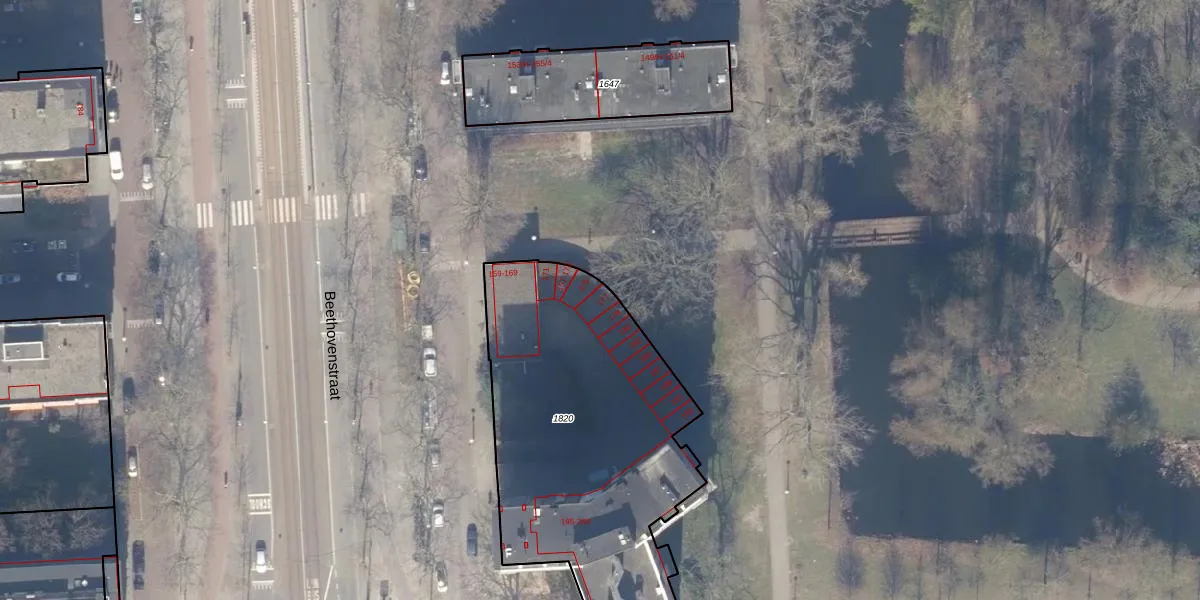 Het perceel waarop Beethovenstraat 177 staat heeft een oppervlakte van 1565 m². Dit is een zeer groot perceel. De perceeloppervlakte wordt geregistreerd door het Kadaster. Gedetailleerde informatie over de maten van dit perceel kunt u vinden in het rapport Kadastrale kaart met maatvoering van Beethovenstraat 177.