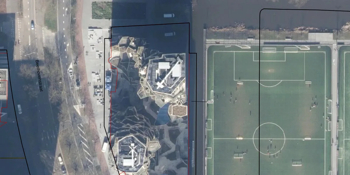 Het perceel waarop Beethovenstraat 445 staat heeft een oppervlakte van 5965 m². Dit is een zeer groot perceel. De perceeloppervlakte wordt geregistreerd door het Kadaster. Gedetailleerde informatie over de maten van dit perceel kunt u vinden in het rapport Kadastrale kaart met maatvoering van Beethovenstraat 445.