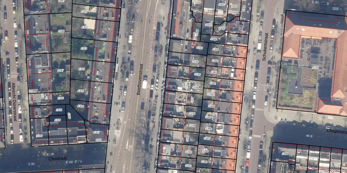 Het perceel waarop Beethovenstraat 55-H staat heeft een oppervlakte van 169 m². Dit is een middelgroot perceel. De perceeloppervlakte wordt geregistreerd door het Kadaster. Gedetailleerde informatie over de maten van dit perceel kunt u vinden in het rapport Kadastrale kaart met maatvoering van Beethovenstraat 55-H.
