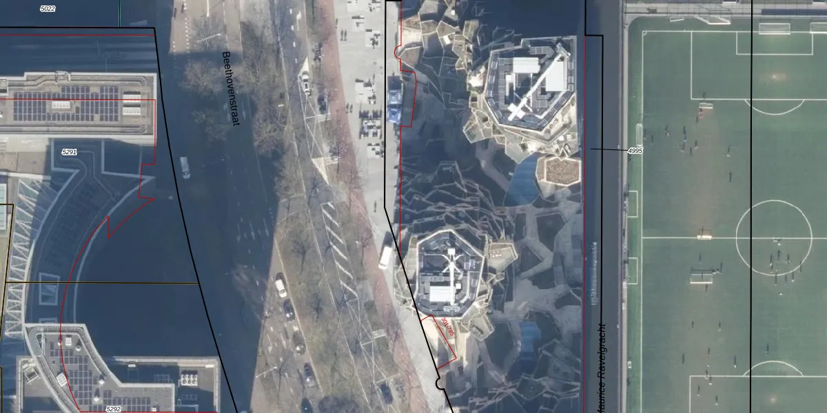 Het perceel waarop Beethovenstraat 625 staat heeft een oppervlakte van 5965 m². Dit is een zeer groot perceel. De perceeloppervlakte wordt geregistreerd door het Kadaster. Gedetailleerde informatie over de maten van dit perceel kunt u vinden in het rapport Kadastrale kaart met maatvoering van Beethovenstraat 625.