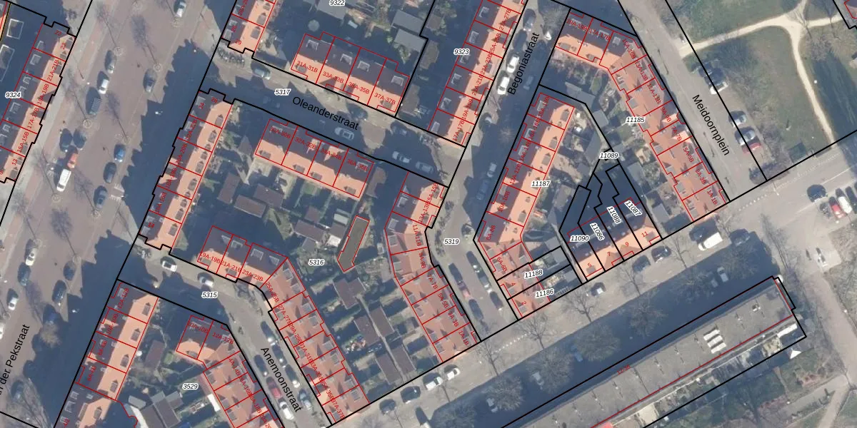 Het perceel waarop Begoniastraat 13-A staat heeft een oppervlakte van 3282 m². Dit is een zeer groot perceel. De perceeloppervlakte wordt geregistreerd door het Kadaster. Gedetailleerde informatie over de maten van dit perceel kunt u vinden in het rapport Kadastrale kaart met maatvoering van Begoniastraat 13-A.
