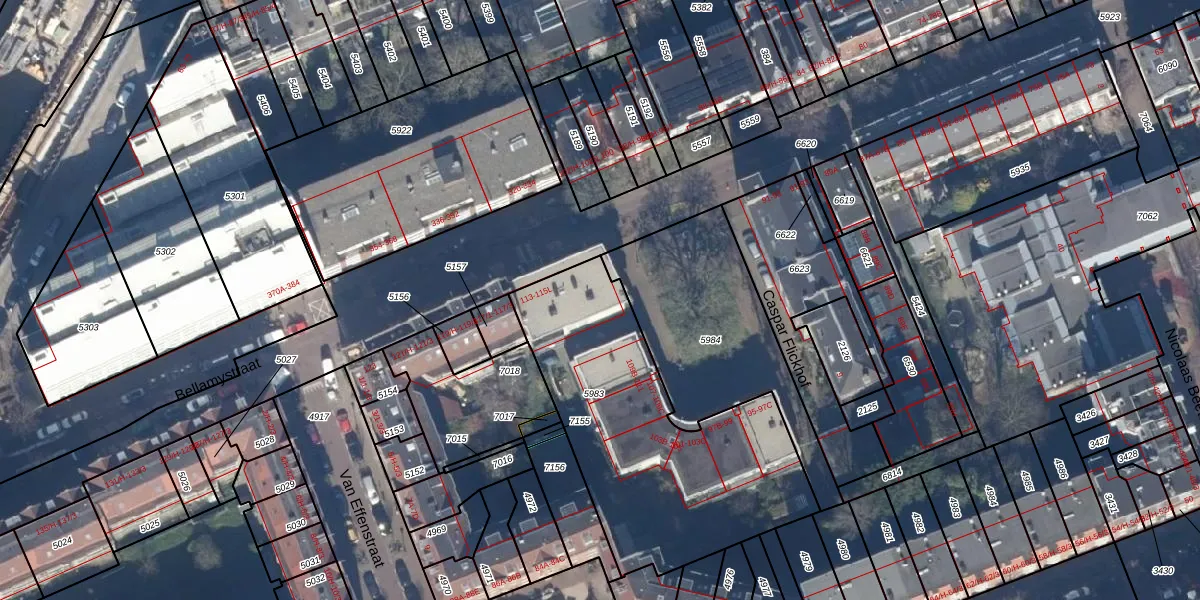 Het perceel waarop Bellamystraat 115-F staat heeft een oppervlakte van 1295 m². Dit is een zeer groot perceel. De perceeloppervlakte wordt geregistreerd door het Kadaster. Gedetailleerde informatie over de maten van dit perceel kunt u vinden in het rapport Kadastrale kaart met maatvoering van Bellamystraat 115-F.