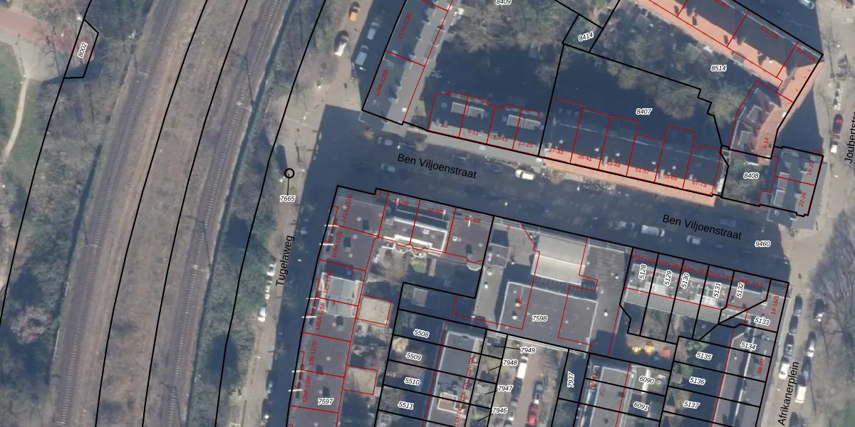 Het perceel waarop Ben Viljoenstraat 4-B staat heeft een oppervlakte van 2953 m². Dit is een zeer groot perceel. De perceeloppervlakte wordt geregistreerd door het Kadaster. Gedetailleerde informatie over de maten van dit perceel kunt u vinden in het rapport Kadastrale kaart met maatvoering van Ben Viljoenstraat 4-B.