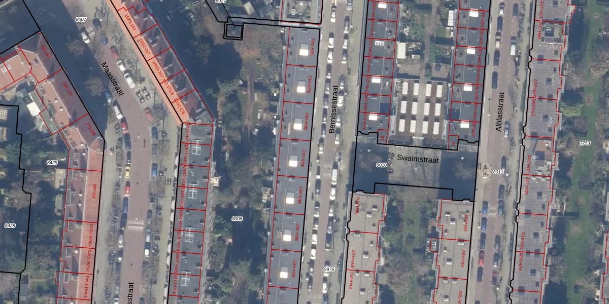 Het perceel waarop het adres ligt is ASD18-V-8008. De afkorting 'ASD18' staat voor kadastrale gemeente Amsterdam. Het perceel is met 6860 m² relatief groot. Het gemiddelde ligt in de kadastrale gemeente Amsterdam op 558,8 m². De grootste perceeloppervlakte in de kadastrale gemeente is 12,5 ha. De kleinste oppervlakte bedraagt 0 m². Er zijn 158 adressen aanwezig op het perceel. De huidige grenzen van het perceel zijn digitaal in de Basisregistratie Kadaster (BRK) geregistreerd op 09-03-2010.
