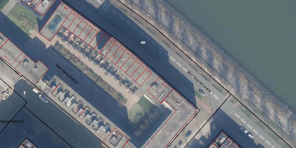Bert Haanstrakade 214 is gelegen op kadastraal perceel ASD41AU634. Deze kadastrale aanduiding is uniek en wordt gebruikt door het Kadaster om eigendomsrechten en andere zakelijke rechten vast te leggen. Het perceel maakt onderdeel uit van de kadastrale gemeente Amsterdam.
