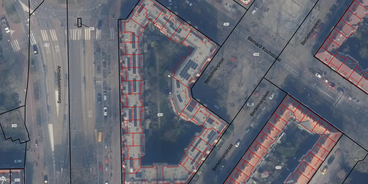 Bertelmanplein 100 is gelegen op kadastraal perceel ASD24AC369. Deze kadastrale aanduiding is uniek en wordt gebruikt door het Kadaster om eigendomsrechten en andere zakelijke rechten vast te leggen. Het perceel maakt onderdeel uit van de kadastrale gemeente Amsterdam.