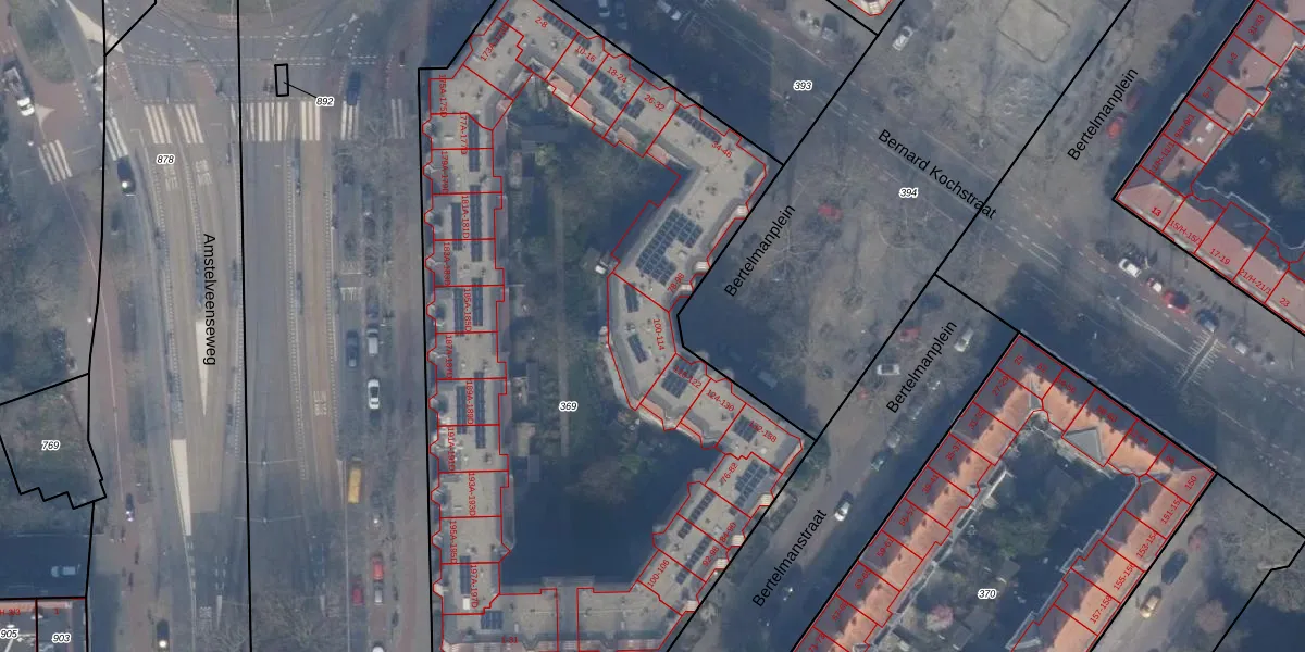 Bertelmanplein 104 is gelegen op kadastraal perceel ASD24AC369. Deze kadastrale aanduiding is uniek en wordt gebruikt door het Kadaster om eigendomsrechten en andere zakelijke rechten vast te leggen. Het perceel maakt onderdeel uit van de kadastrale gemeente Amsterdam.