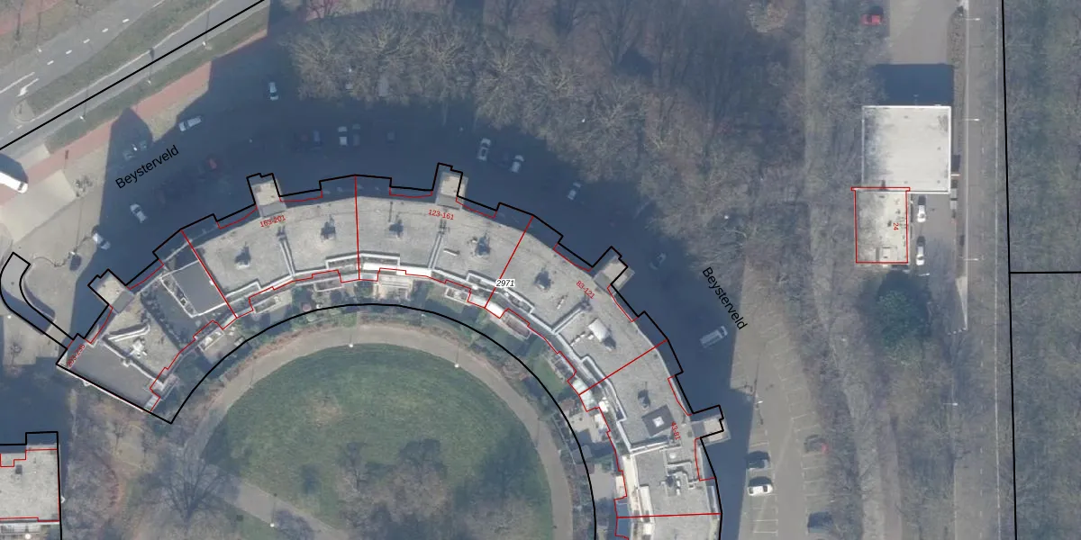 Beysterveld 121 is gelegen op kadastraal perceel ASD30AK2971. Deze kadastrale aanduiding is uniek en wordt gebruikt door het Kadaster om eigendomsrechten en andere zakelijke rechten vast te leggen. Het perceel maakt onderdeel uit van de kadastrale gemeente Amsterdam.