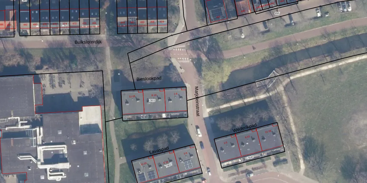 Het perceel waarop Bieslookpad 1 staat heeft een oppervlakte van 587 m². Dit is een groot perceel. De perceeloppervlakte wordt geregistreerd door het Kadaster. Gedetailleerde informatie over de maten van dit perceel kunt u vinden in het rapport Kadastrale kaart met maatvoering van Bieslookpad 1.