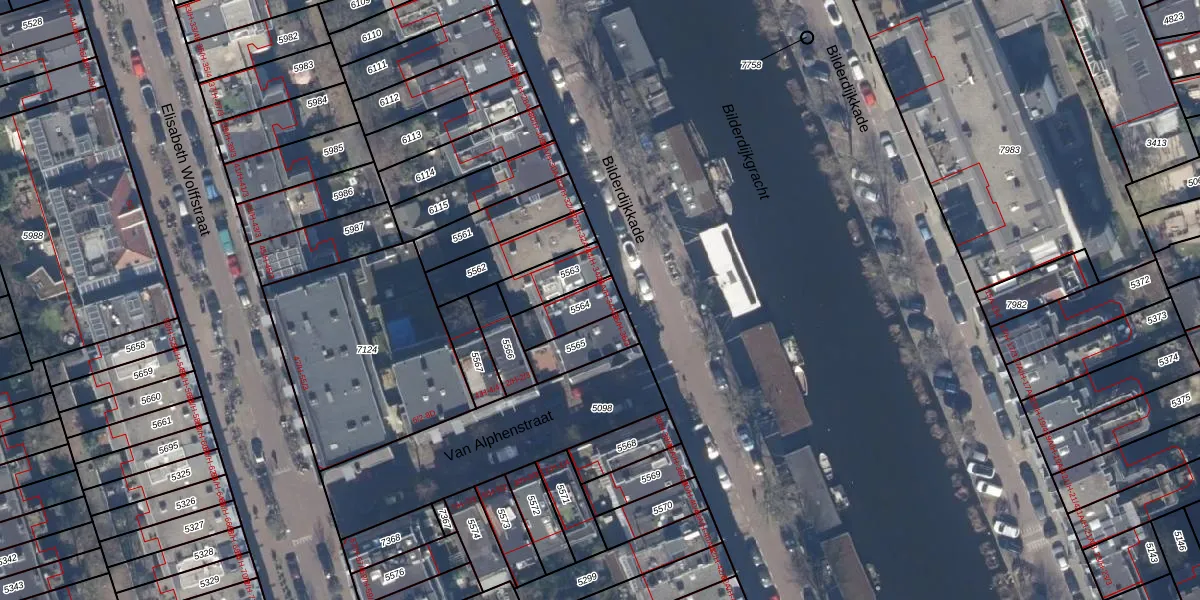 Bilderdijkkade 34-A-H is gelegen op kadastraal perceel ASD13Q5564. Deze kadastrale aanduiding is uniek en wordt gebruikt door het Kadaster om eigendomsrechten en andere zakelijke rechten vast te leggen. Het perceel maakt onderdeel uit van de kadastrale gemeente Amsterdam.