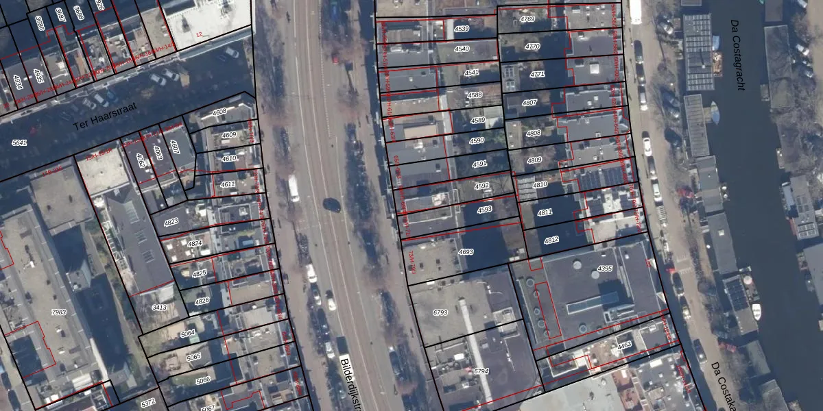 Het perceel waarop het adres ligt is ASD13-Q-4592. De afkorting 'ASD13' staat voor kadastrale gemeente Amsterdam. Het perceel is 171 m² groot. Dat is kleiner dan de gemiddelde perceeloppervlakte in Amsterdam, dat op 392,9 m² ligt. De grootste perceeloppervlakte in de kadastrale gemeente is 4,8 ha. De kleinste oppervlakte bedraagt 1 m². Op het perceel zijn 11 adressen aanwezig. De huidige grenzen van het perceel zijn digitaal in de Basisregistratie Kadaster (BRK) geregistreerd op 28-11-1997.