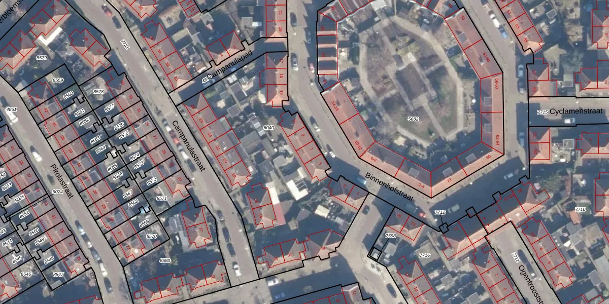 Het perceel waarop Binnenhofstraat 7 staat heeft een oppervlakte van 2310 m². Dit is een zeer groot perceel. De perceeloppervlakte wordt geregistreerd door het Kadaster. Gedetailleerde informatie over de maten van dit perceel kunt u vinden in het rapport Kadastrale kaart met maatvoering van Binnenhofstraat 7.