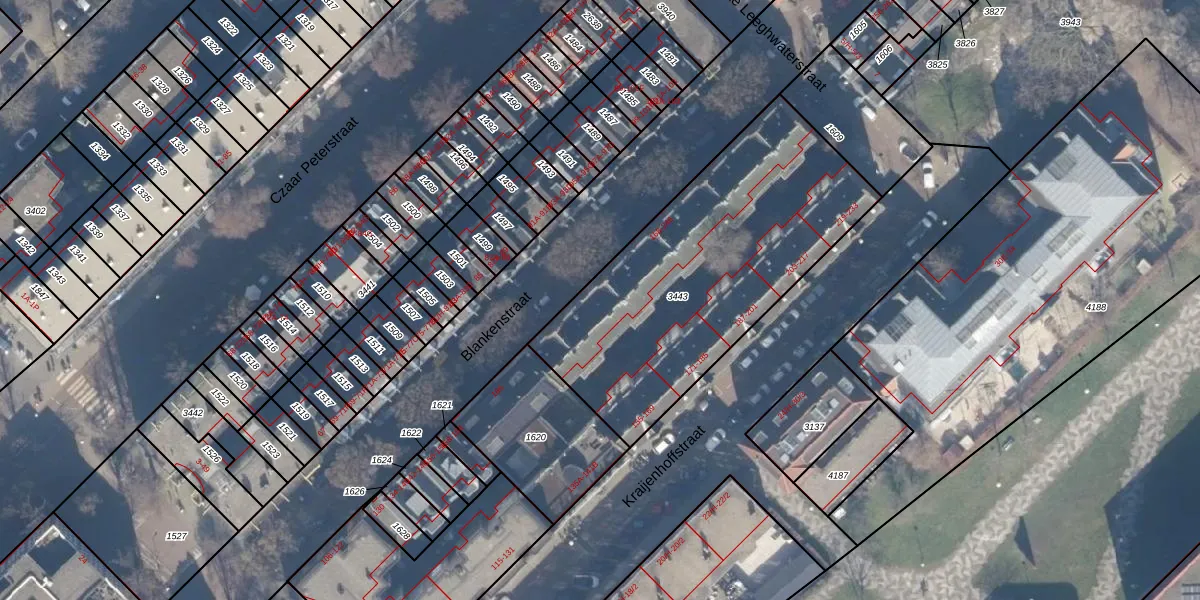 Het perceel waarop Blankenstraat 186 staat heeft een oppervlakte van 1422 m². Dit is een zeer groot perceel. De perceeloppervlakte wordt geregistreerd door het Kadaster. Gedetailleerde informatie over de maten van dit perceel kunt u vinden in het rapport Kadastrale kaart met maatvoering van Blankenstraat 186.